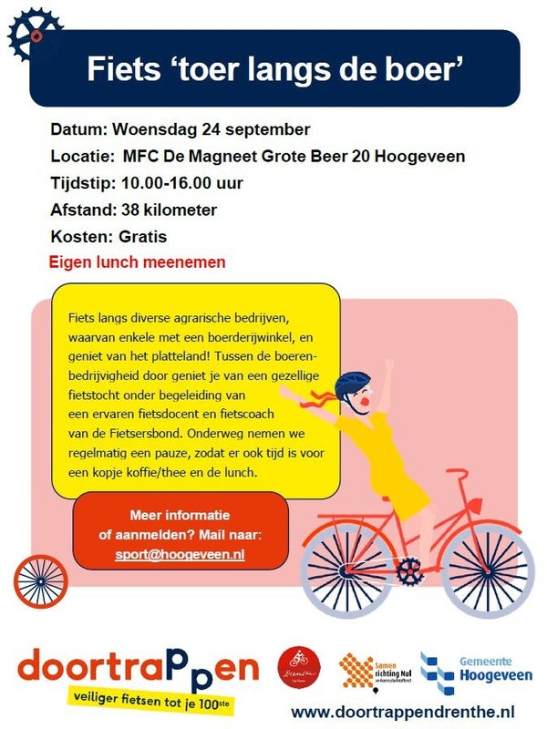 Hoogeveen, 14 september 2025 - Op woensdag 24 september organiseert Doortrappen Drenthe de Fiets Toer langs de Boer in Hoogeveen.