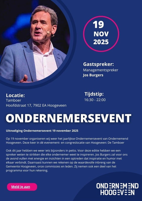 Hoogeveen, 1 oktober 2025 - Op 19 november wordt het jaarlijkse Ondernemersevent van Ondernemend Hoogeveen georganiseerd in de Tamboer.